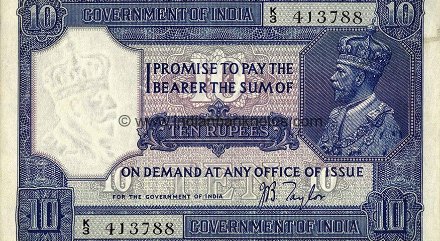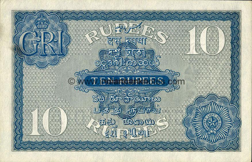 GOVERNMENT OF INDIA in top and lower margin. Portrait of King George V in right window. Serial number on top right and lower left. 10 on all four corners. 10 underprint in white with TEN RUPEES in Central Denomination Panel. Relief underprint 10 TEN 10 in signature panel.