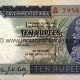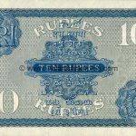 GRI in ornate panel on top left. The motto of Star of India – Heavens Light Our Guide on lower right. 10 on top right and lower left, arched RUPEES above and below the language panel. TEN RUPEES in centre divides the language panel.