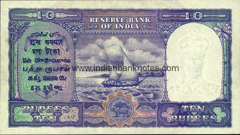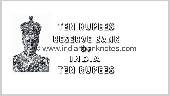 Facing portrait of King George VI. TEN RUPEES / RESERVE BANK /OF / INDIA / TEN RUPEES in five lines.