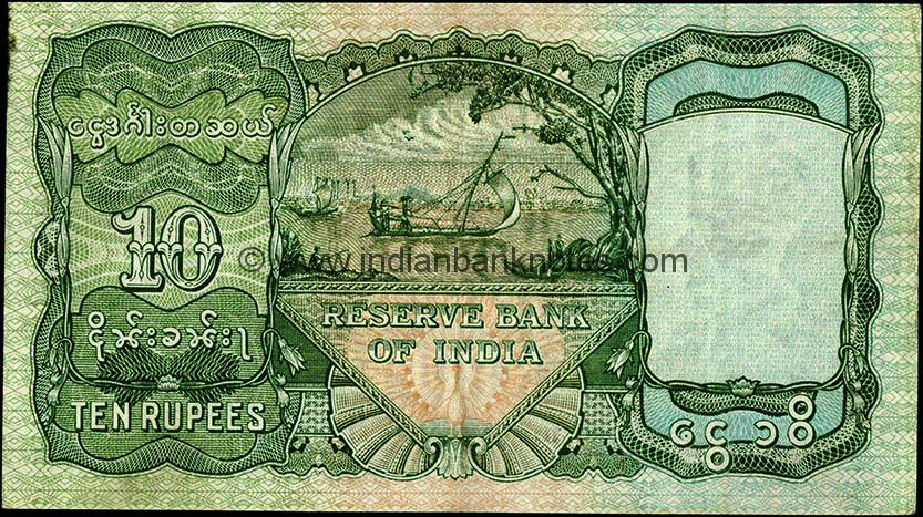 RESERVE BANK / OF INDIA below Sailing Dhow in centre. 10 divides Burmese denomination in words. TEN RUPEES in lower left and Rs. 10 in Burmese in lower right.