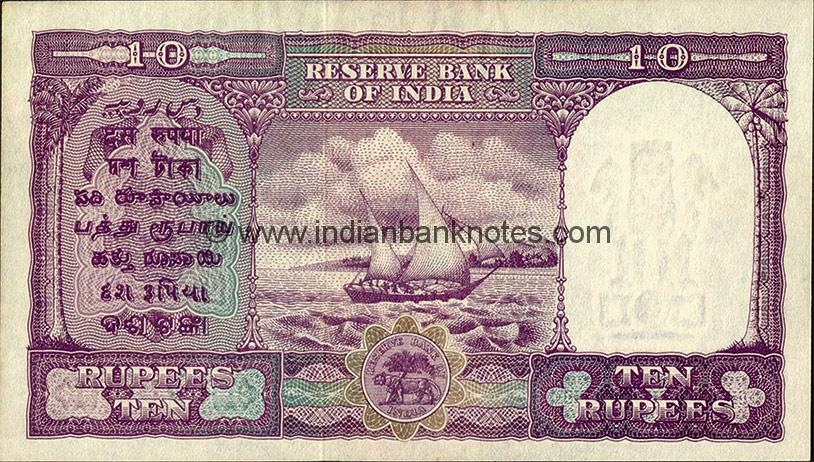 RESERVE BANK / OF INDIA in two lines in centre, language panel on left window. Sailing boat or dhow in central panel. RBI seal in centre below. 10 in top corners. RUPEES / TEN below left window and TEN / RUPEES below watermark window. Palm trees on either end of windows.