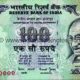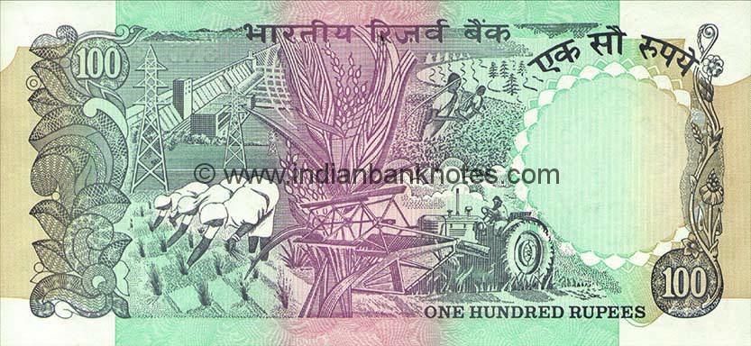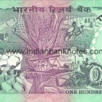 Ashoka Pillar with 6 wheels in background on left . Stylised RBI monogram in centre, bold 100 in lower right.