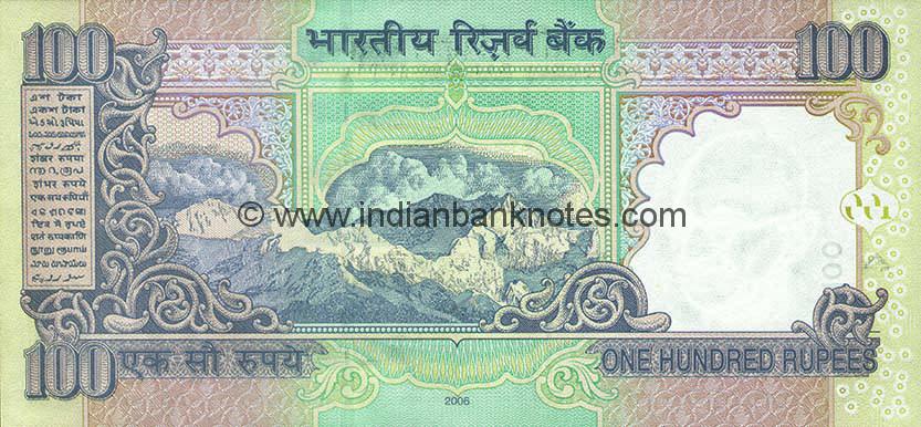Same as Type 6.7.11 except a 3 mm wide security thread with colour shift from green to blue when viewed from different angles. the security thread when viewed from reverse will appear as a continuous line. 100 added to left of Mahatma Gandhi and five horizontal bands in the centre in watermark. New front to back see through register above Ashoka Pillar reads 100 when viewed against light. Year of issue added on reverse. Additional circular floral prints added on either side of Reserve Bank of India on obverse and in right margin on reverse. Colour change from blue to yellow in margins on reverse.