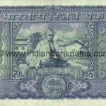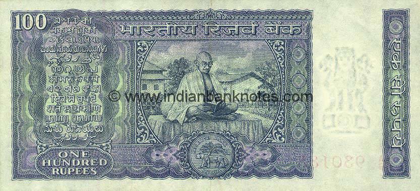 Vignette: Ashoka Pillar and seated Mahatma Gandhi reading book at the Sabarmati Ashram compound on reverse. RESERVE BANK OF INDIA in centre, GUARANTEED BY THE CENTRAL GOVERNMENT and Promise Text in English and Hindi. Signed by Governor in English and Hindi. 100 in Central Denomination Panel. EK SAU RUPAYE in Hindi below Ashoka Pillar. ONE HUNDRED RUPEES vertically in left margin. Red serial number on top right and lower left. Relief underprint of ‘100 Rs.’ within top serial number panel.