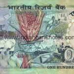 Same as Type 6.7.8 except ‘Satyameva Jayate’ added below Ashoka Pillar, horizontal line in lower margin reduced to stop before EK SAU RUPAYE in Hindi which has shifted below. The font size of EK SAU RUPAYE in Hindi increased.