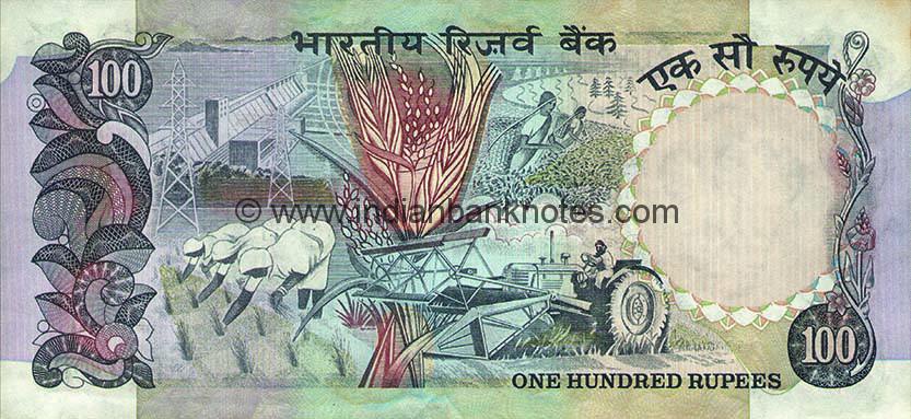 Ashoka Pillar with 6 wheels in background on left . Stylised RBI monogram in centre, bold 100 in lower right.