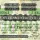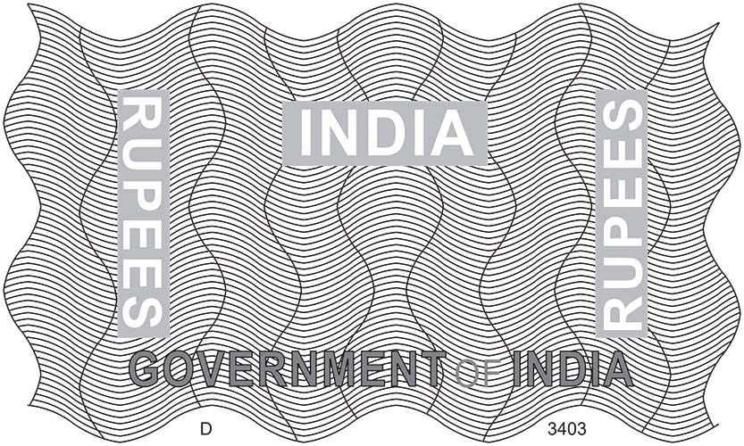 Wavy lines within a wavy rectangular panel. INDIA in centre and GOVERNMENT OF INDIA below. Vertical RUPEES inverted on either side. Plate number in an alphabet in lower left and week and year of manufacture in four digits on lower right.