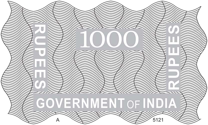 Type1: Wavy lines within a wavy rectangular panel. INDIA in centre and GOVERNMENT OF INDIA below. Vertical RUPEES inverted on either side. Plate number in an alphabet in lower left and week and year of manufacture in four digits on lower right.