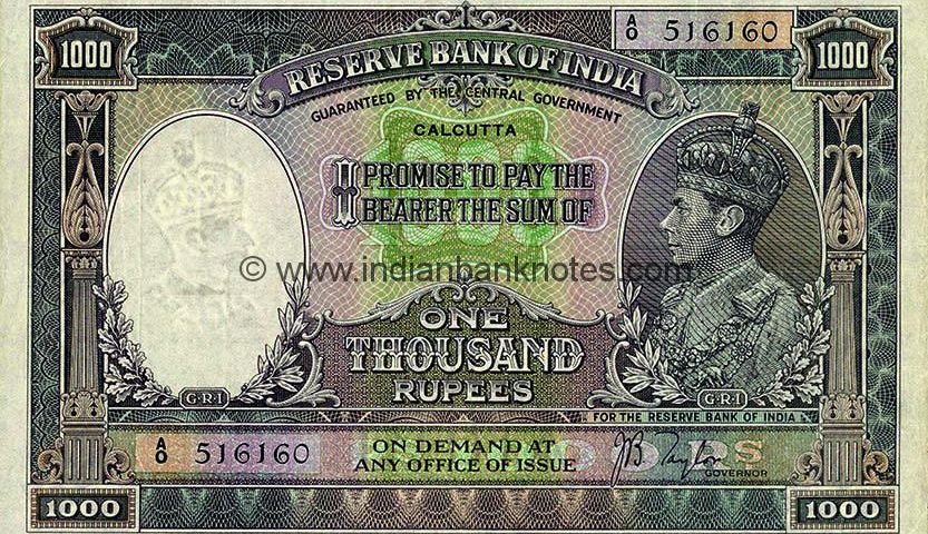 RESERVE BANK OF INDIA in top centre, GUARANTEED BY THE CENTRAL GOVERNMENT below it. Portrait of King George VI in right window.