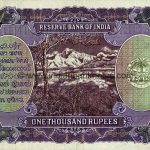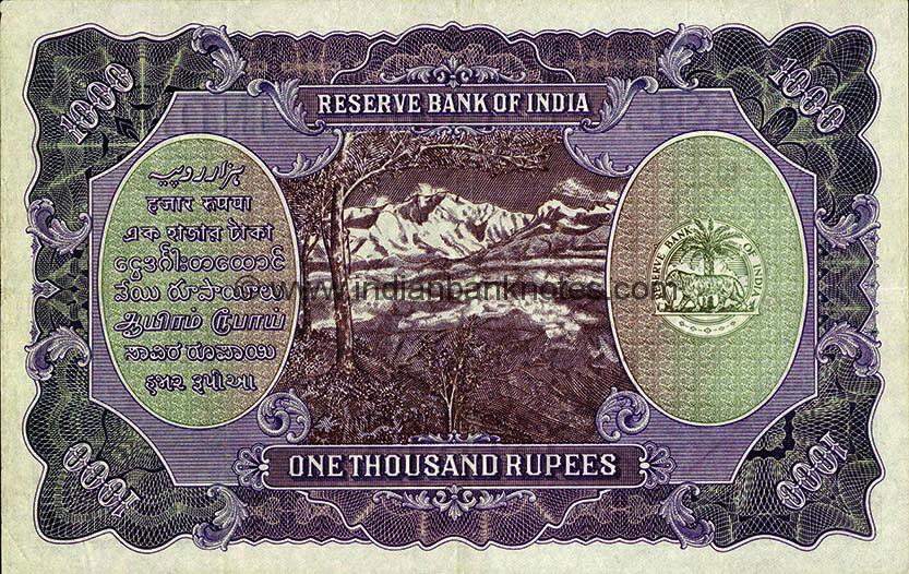 RESERVE BANK OF INDIA on top. Snow capped mountain range in background with trees in foreground in centre. ONE THOUSAND RUPEES below. 1000 in four corners. Language panel in left window. RBI logo in right window.