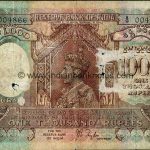 numbers on either side on top. Promise text below portrait. ONE THOUSAND RUPEES in Lower Denomination Panel. Signed by GOVERNOR FOR THE / RESERVE BANK / OF INDIA. Burmese mythical lion dragon – Chinthe on either side of the temple entrance.