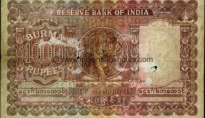 RESERVE BANK OF INDIA above. Peacock in top corners. Prowling tiger in the centre. ONE THOUSAND RUPEES and denomination in Burmese in centre below. BURMA / 1000 / RUPEES in left window. Burmese legend in lower corners.