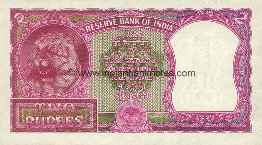 RESERVE BANK OF INDIA above, language panel in centre. Vignette of Bengal Tiger on left. TWO RUPEES below it. 2 in Hindi in top left corner and 2 in top right corner. RBI seal below language panel.