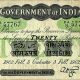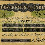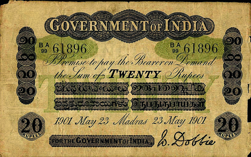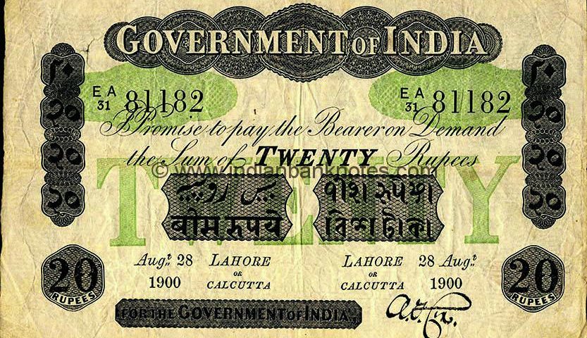 GOVERNMENT OF INDIA in centre. Two serial numbers on either side. Two sets of mirrored date on either side and the circle of issue below language panel. The language panels are below promise text. Denomination panels are on either side. 20 / RUPEES in a hexagon in lower corners. FOR THE GOVERNMENT OF INDIA in a panel on lower left with the signature to its right. Green underprint of irregular ovals under serial number and large TWENTY in the middle.