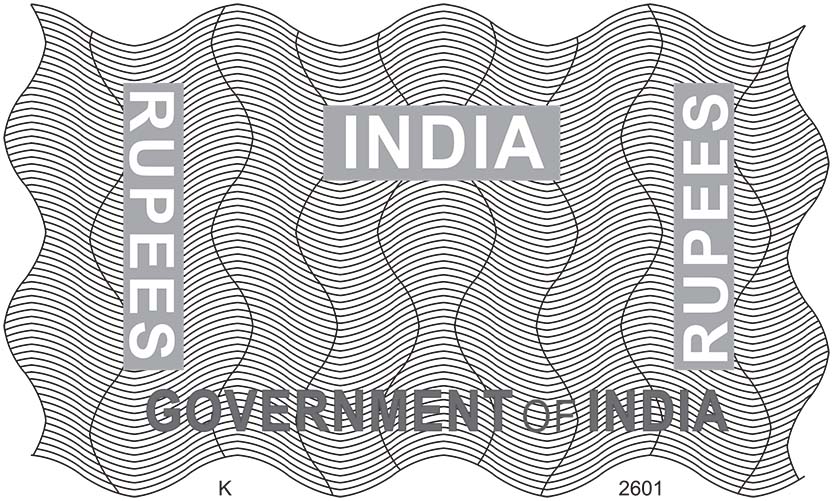 Wavy lines within a wavy rectangular panel. INDIA in centre and GOVERNMENT OF INDIA below. Vertical RUPEES inverted on either side. Plate number in an alphabet in lower left and week and year of manufacture in four digits on lower right.