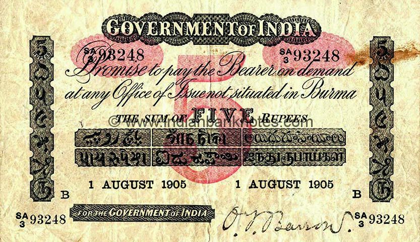 | 2A.I.3 A Circle Initial B (Bombay) (1903 - 1907) Language panel and denomination panel 5 | ||