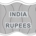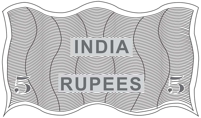 Wavy lines within a wavy rectangular panel. INDIA in centre and 5 RUPEES 5 below.