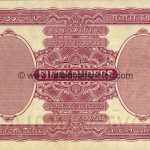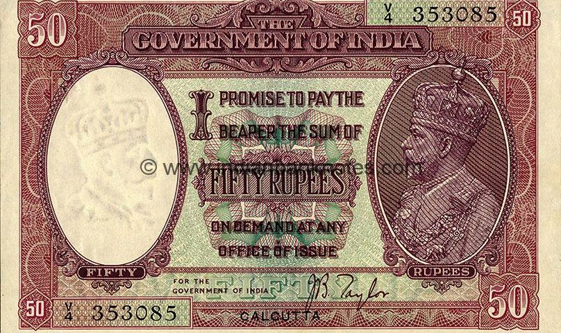 THE / GOVERNMENT OF INDIA in top. Portrait of King George V in right window. Serial number on top right and lower left. 50 on all four corners. FIFTY below watermark window and RUPEES below portrait window. Circle of issue in lower margin. Relief underprint FIFTY in