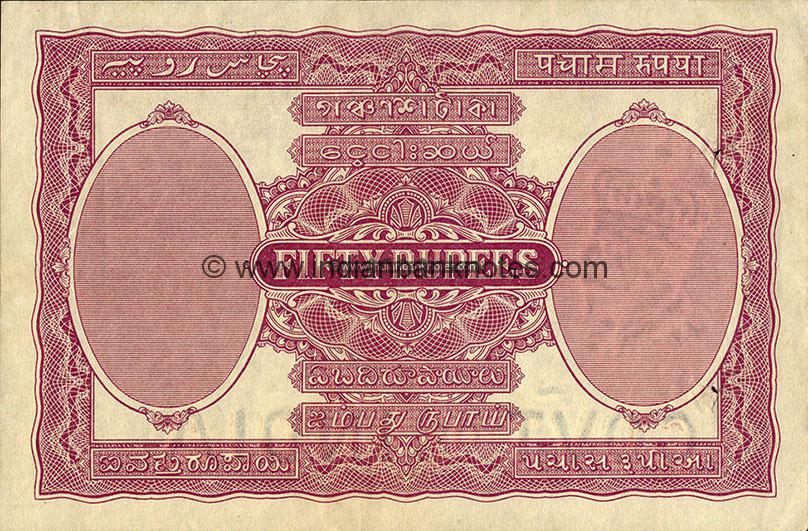 GOVERNMENT OF INDIA FIFTY RUPEES radiating from the promise text panel and GOVERNMENT/ OF INDIA with FIFTY in centre in a diamond and RUPEES FIFTY/ FIFTY RUPEES with 50 in centre in another diamond alternating as a pattern in the signature panel.