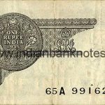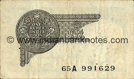 Dated 1935; Issued on 24th July 1940. GOVERNMENT OF INDIA above. Language panel on left and image of silver coin of King George V dated 1935 with obverse in front and reverse in rear. Re. 1 – the abbreviation of Rupee used for the first time in top right hand corner. ONE / RUPEE in Central Denomination Panel. Large ‘1’ beside language panel in white. No promise text. Signed by “Controller of the Currency”. This denomination is treated as a coin.